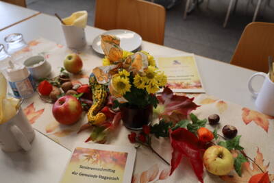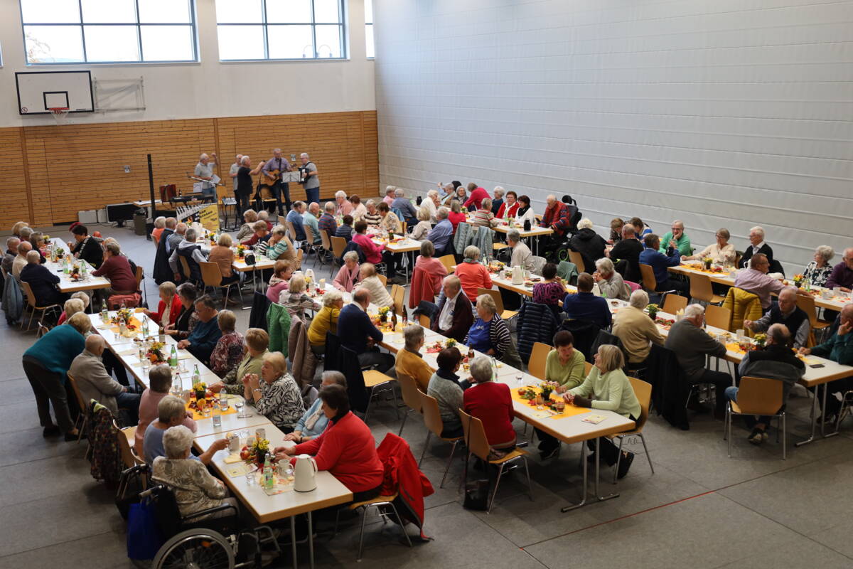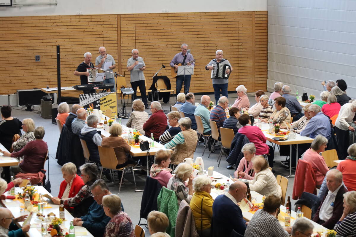 Am 13.10.2025 hat der inzwischen schon fast traditionelle Seniorennachmittag der Gemeinde Stegaurach in der herbstlich dekorierten Aurachtalhalle stattgefunden. 120 Seniorinnen und Senioren hatten sich zu dem geselligen Beisammensein angemeldet und ließen es sich bei Kaffee, Kuchen, Federweißer und einer Suppenauswahl einige Stunden gut gehen.